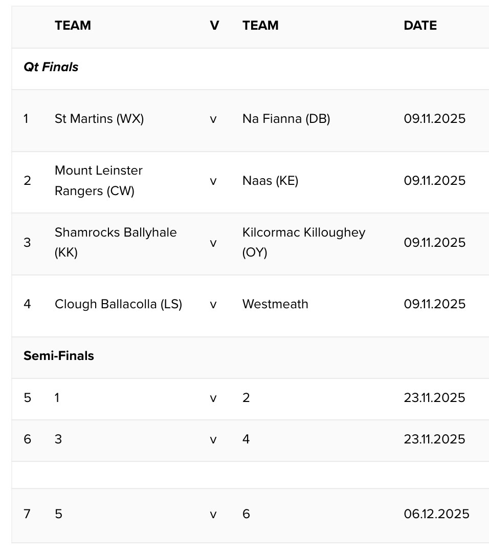 If Na Fianna progress from that, they will face the winners of Naas v Mount Leinster Rangers in the Semi-Final.