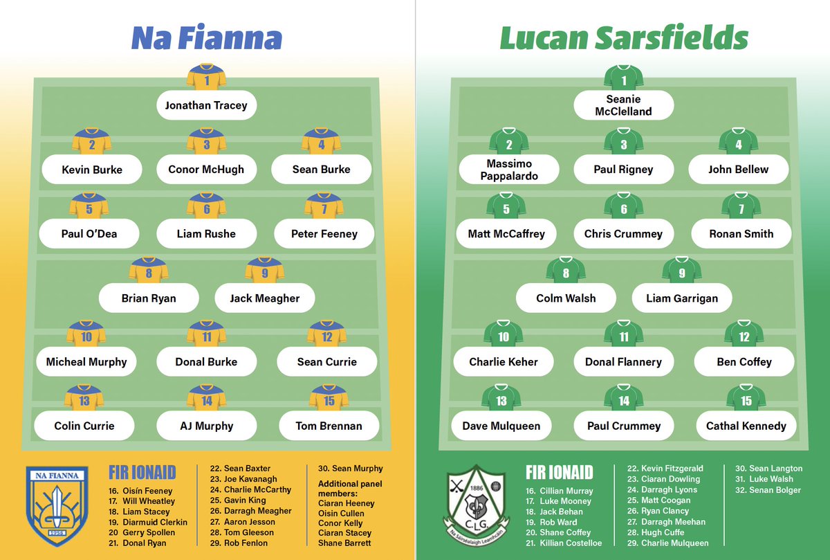 To me that looks a very strong Na Fianna 15 and bench, not just in terms of hurling but experience and physical conditioning as well. Lucan look really good from 1-9 and have some good established forwards but, for me, their forwards aren't as established at Seinor level as their oppositon today and for that reason i can see them struggling to keep the scores ticking over with the same rate as Na Fianna - and thats not a slight on Lucan, Na Fianna are all Ireland Champsions for a reason.